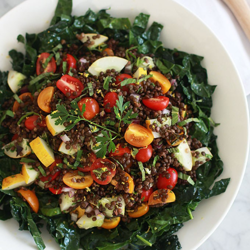 - In the same bowl, add lentils, cucumber, tomatoes, onion, parsley, basil, and the rest of the dressing. Gently toss to combine. Spread over kale and enjoy!